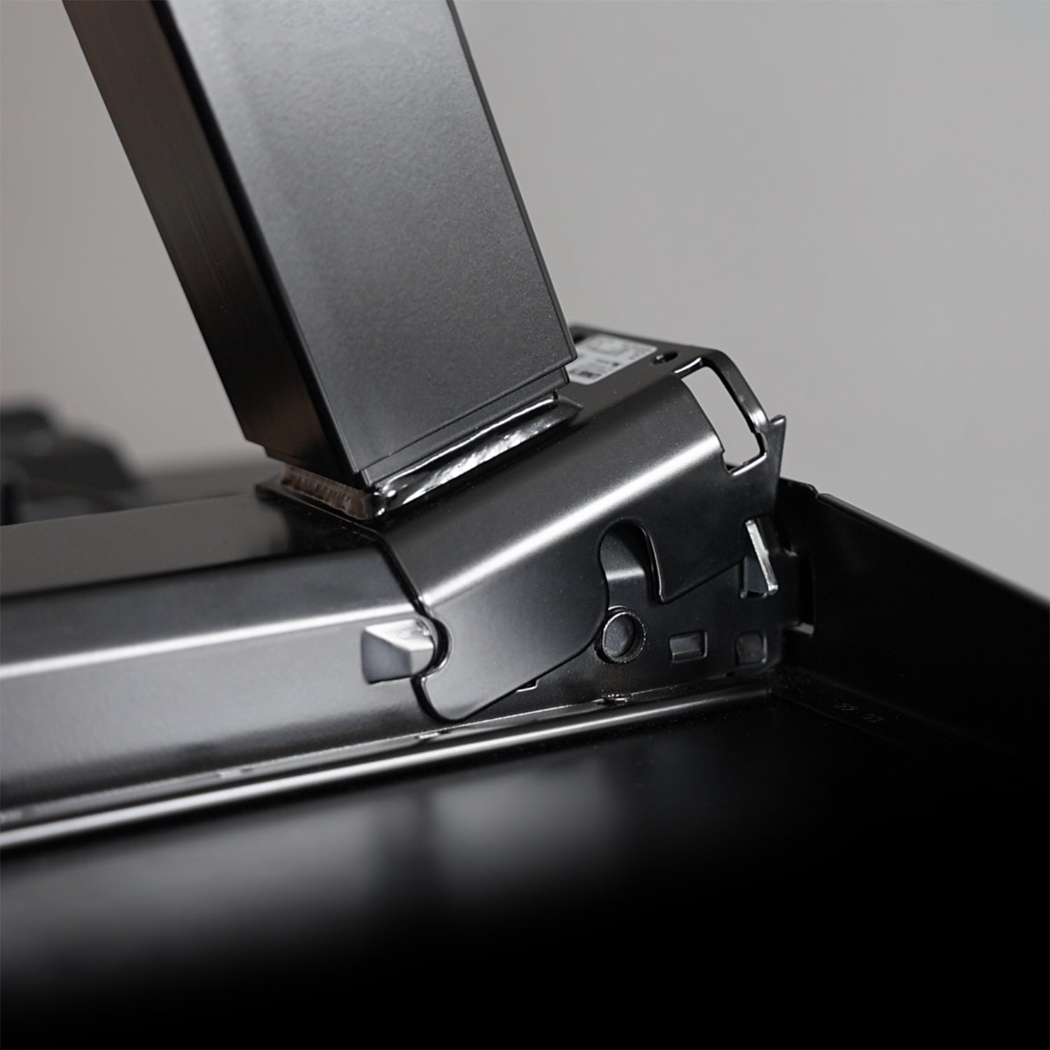 Click & Move On: Einmal auf der Tischplatte montiert, bleibt Quertraverse fest mit der Tischplatte verbunden, die Säulen können dank des Klicksystems werkzeuglos und einfach an- und abmontiert werden.