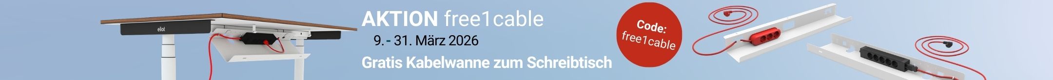 vom 9.-31. März 2026 erhältst du beim Kauf eines Eliot Schreibtisches eine 1cable Kabelwanne nach Wahl gratis* dazu.