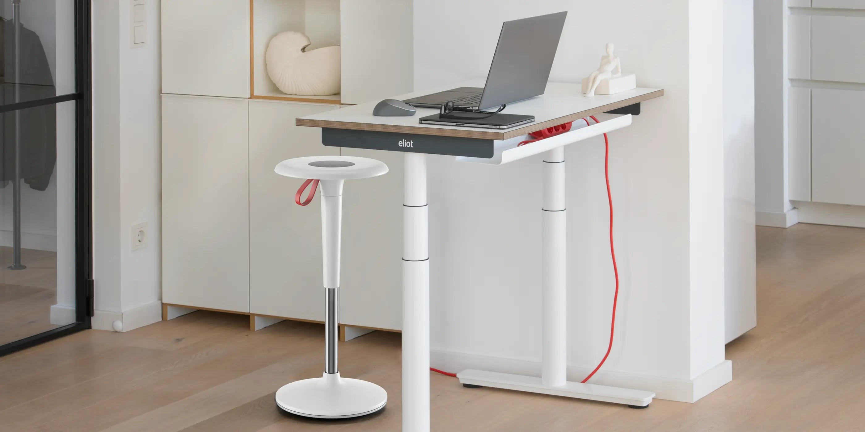Eliot Stühle unterstützen die neue Art zu arbeiten - im Sitzen und im Stehen, optimiert für den höhenverstellbaren Eliot Schreibtisch.